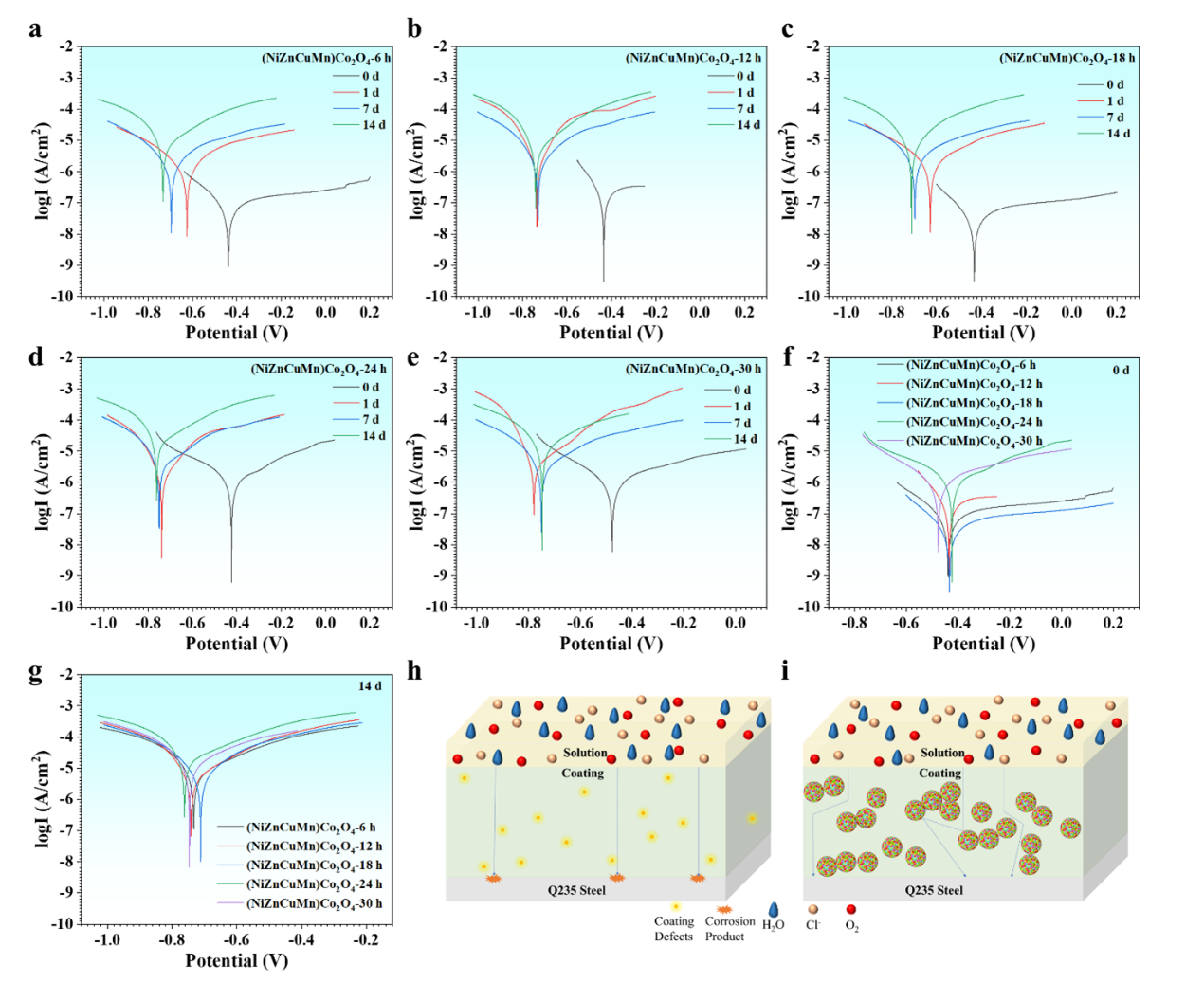 图4 不同浸泡时间的塔菲尔极化曲线:a) (NiZnCuMn)Co2O4–6h,b) (NiZnCuMn)Co2O4–12h,c) (NiZnCuMn)Co2O4–18h,d) (NiZnCuMn)Co2O4–24h,e) (NiZnCuMn)Co2O4–30h;(NiZnCuMn)Co2O4在不同水热时间下的塔菲尔极化曲线,分别对应于在 3.5wt%NaCl溶液中:f) 0 天,g) 14 天的腐蚀情况;样品的防腐保护机制:h) 纯EP,i) (NiZnCuMn)Co2O4 /EP。