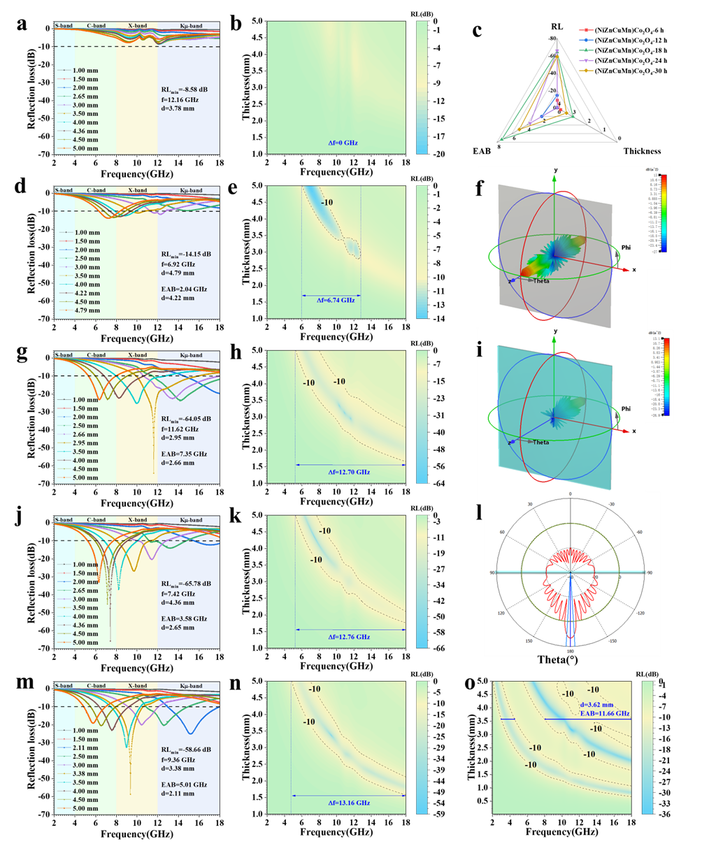 图2 二维RL值及对应厚度图示:a)-b)(NiZnCuMn)Co2O4 – 6h,d)-e) (NiZnCuMn)Co2O4–12h,g)-h) (NiZnCuMn)Co2O4–18h,j)-k) (NiZnCuMn)Co2O4 – 24h,m)-n) (NiZnCuMn)Co2O4 – 30h;c) 所有样品的性能对比;三维RCS模拟图:f) PEC,i) (NiZnCuMn)Co2O4 – 18h;l) (NiZnCuMn)Co2O4–18h在不同扫描角度下的雷达散射截面值;o) (NiZnCuMn)Co2O4 – 6h +(NiZnCuMn)Co2O4–18h + (NiZnCuMn)Co2O4–24h(三层模拟结构)的二维RL等值线图。