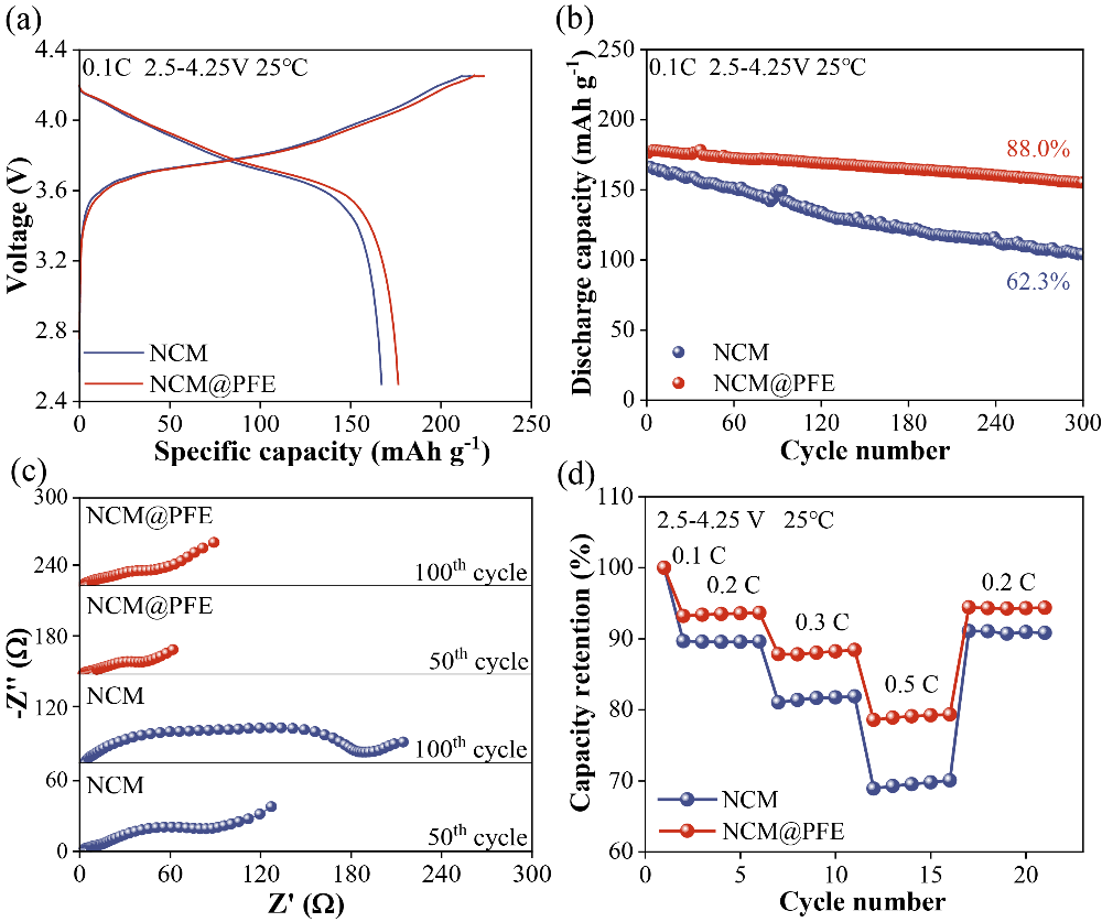 图6(a)固态软包电池在0.1C下的充放电曲线;(b)固态软包电池在0.1C下的循环性能;(c)选定循环次数下固态软包电池的电化学阻抗谱;(d)NCM和NCM@PFE固态软包电池的倍率性能