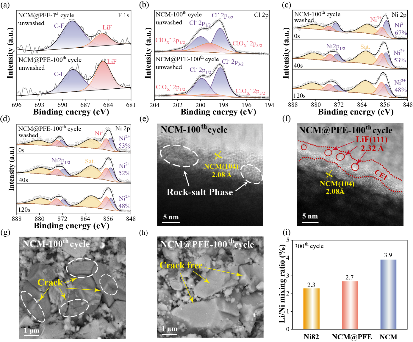 图4(a)NCM@PFE循环1圈和100圈后的XPS测试F 1s谱图;(b)NCM和NCM@PFE循环100圈后的XPS测试Cl 2p谱图;(c-d)循环100圈后,清洗后的(c)NCM和(d)NCM@PFE Ar离子刻蚀XPS测试的Ni 2p谱图;(e-f)循环100圈后,清洗后的(e)NCM和(f)NCM@PFE中Ni82颗粒的TEM图像;(g-h)循环100圈后,(g)NCM和(h)NCM@PFE复合正极的SEM图像;(i)Ni82和循环300圈后的NCM、NCM@PFE中Ni82的Li/Ni混排比例