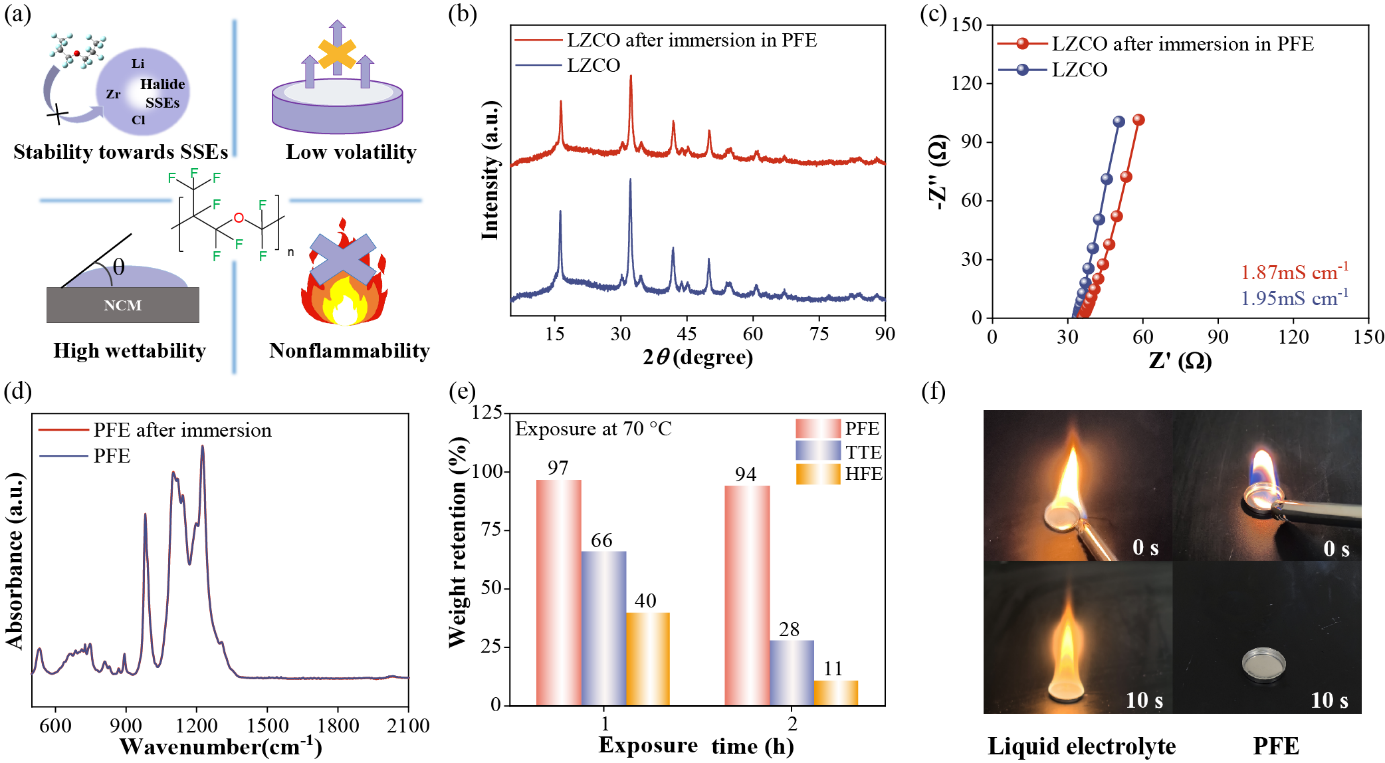 图1(a)PFE的物理化学性质示意图;(b-c)PFE浸泡前后,LZCO粉体的(b)XRD图谱和(c)电导率;(d)PFE浸泡LZCO前后的傅里叶红外光谱;(e)在70°C下,PFE、TTE和HFE挥发不同时间后的质量保持率;(f)液态锂离子电池电解液(12%LiPF6+25%EC+63%DEC)与PFE的点燃实验