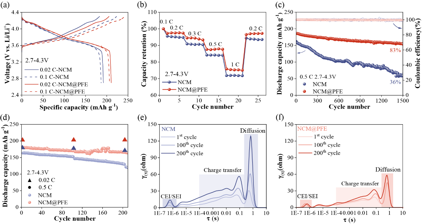 图2(a)NCM和NCM@PFE在0.1C和0.02C下的充放电曲线;(b)NCM和NCM@PFE的倍率性能;(c)NCM和NCM@PFE在0.5C下的循环稳定性;(d)NCM和NCM@PFE在0.5C循环时,每隔100圈进行一圈0.02C的充放电,得到的不同圈数下的放电比容量图;(e-f)不同圈数下,NCM和NCM@PFE的(f)EIS和相应的(g-h)DRT谱图