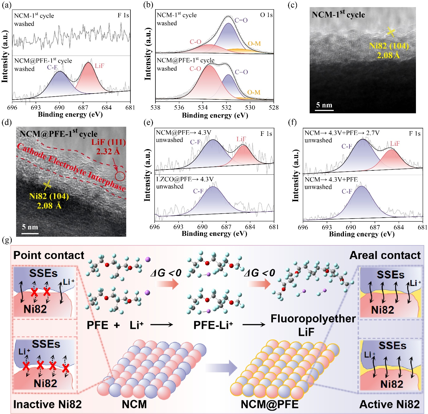 图3(a) 经过一次充放电循环后,洗涤过的NCM和NCM@PFE电极的F 1s和(b)O 1s XPS谱图;(c)经过一次充放电循环后,洗涤过的NCM和(d)NCM@PFE中Ni82颗粒的HRTEM图像;(e)线性扫描伏安法(LSV)扫描至4.3 V后,NCM@PFE和LZCO@PFE的F 1s XPS谱图;(f)完全充电的NCM复合正极与PFE混合随后通过LSV放电至2.7 V和直接混合后的F 1s XPS谱图;(g)复合正极中PFE衍生的CEI形成及界面接触演变的示意图